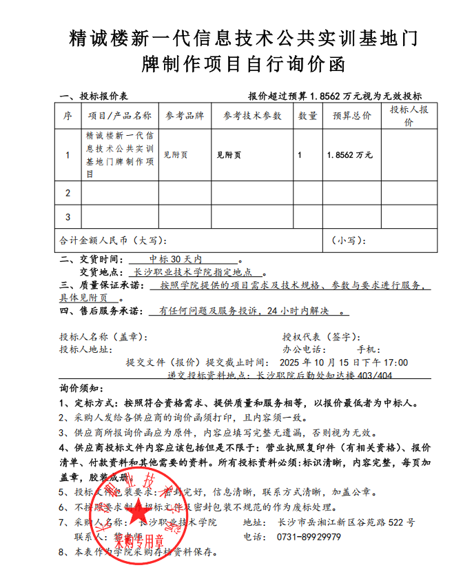 精诚楼新一代信息技术公共实训基地门牌制作项目自行询价函